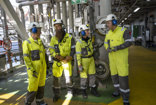 LO-leder Peggy Hessen Følsvik og Frode Alfheim på offshoretur. Foto: Atle Espen Helgesen